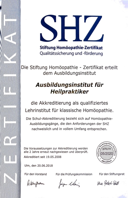 Wir arbeiten ständig daran, die von uns angebotene, hohe Ausbildungsqualität noch weiter zu verbessern, daher haben wir unsere Homöopathie-Ausbildung an die Qualitätskriterien der SHZ (Stiftung Homöopathie- Zertifikat) angepasst und somit für unsere Homöopathie-Ausbildung den Status als akkreditierte Ausbildungsstätte erhalten.